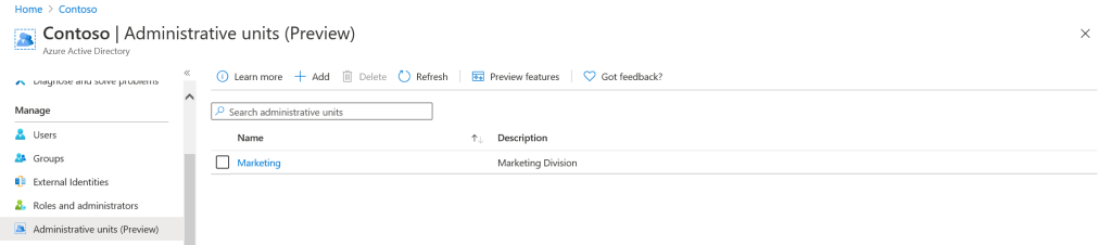 To achieve this we first create an Administrative Unit in the Azure AD Portal.