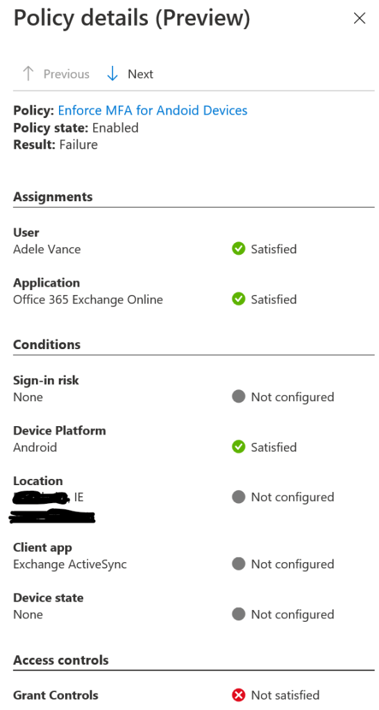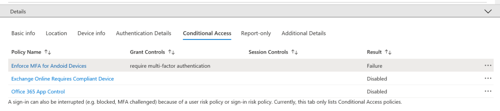 Here we can see step by step exactly what happened with our Conditional Access policy. We see the criteria applied in the policy and the results of each step. This feature adds to the already brilliant Azure AD Sign-In logs experience and will save admins a lot of time troubleshooting and testing Conditional Access Policies.