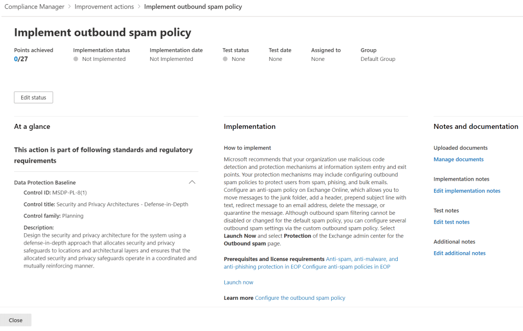 Like the traditional Secure Score, this score is relative to Microsoft 365 but may not reflect the overall security posture of the organization. For example, you can gain 27 points by implementing a spam filter, however, Microsoft’s tools will not be aware of a third party spam filter that sits in front of Exchange Online. Note: Automated tests are not available for all actions so it’s important to manually review them. We can enable automated testing on all or a subset of actions in the Compliance Manager Settings.