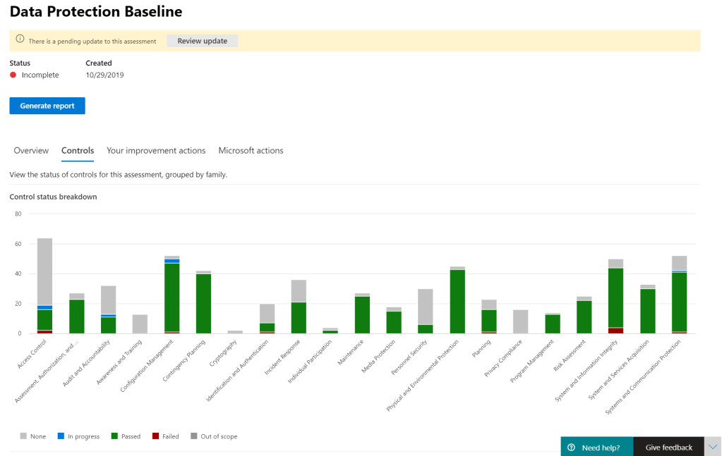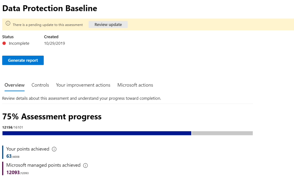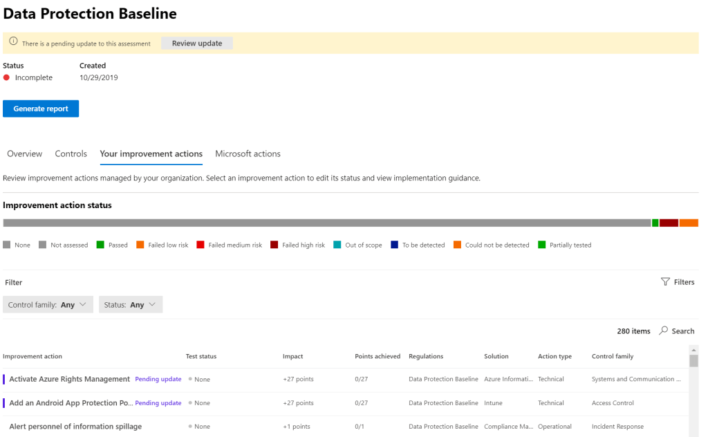 The first think you’ll notice when opening the tool, is the Compliance Score rating. This rating which is based on a range of both Microsoft and Organizational controls, gives a quick metric of the compliance performance in the organization.