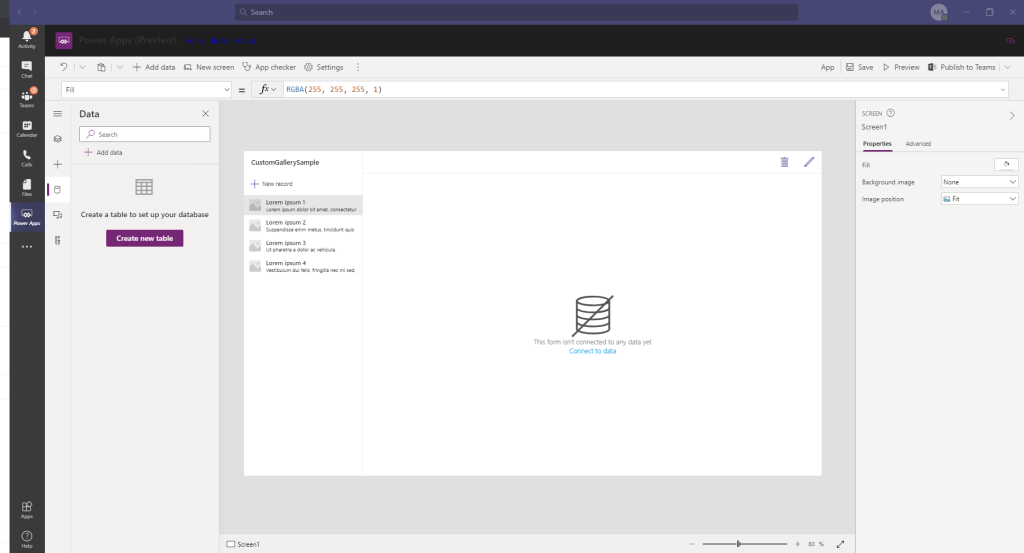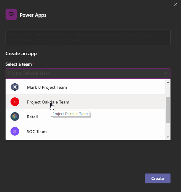 Let’s take a look at how we can put all of this into use. First, from our Teams Client, we add and open the PowerApps Teams app. Once open, we can create an app in a Team as below. There are also some premade apps and lots of learning material to go through if needed.