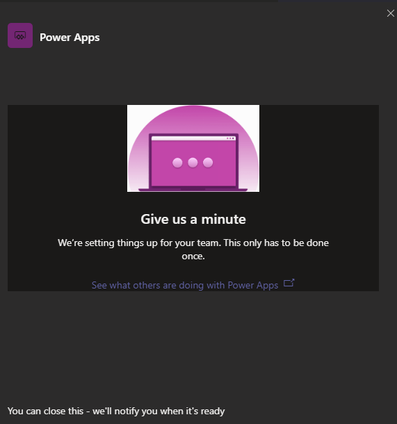 Once added, if this is the first App in the Team, it will take a moment to set up the back end environment to host our App.
