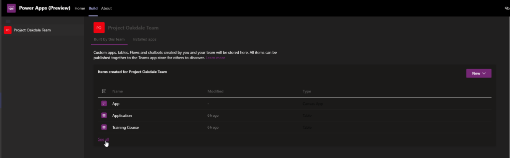 Next, we’ll set up a relationship between the two tables. Navigate to the PowerApps tile, open the “Build” tab and select “See all”.