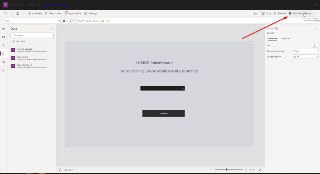 When the frontend and any logic is up to date we can publish the app to the Team easily by clicking the ‘Publish to Team’ button. This will allow all members of the Team, including guests (Subject to licensing), to see and use the app!