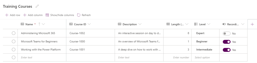 Now that we have our table created, let’s populate it with some training courses available to our users, adding some details that we want to store for each. Let’s add in Course ID as an auto number to use as a unique identifier so we can associate the applications to courses. We’ll also add in a few courses that are available.