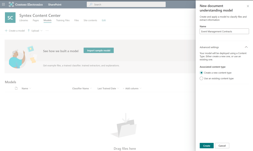 First, let’s open the Models page and create a new document understanding model. We’ll create a model to assess Event Management Contracts on one of our document libraries. We’ll also create a new Content Type as part of the model creation.