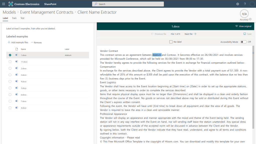 Now let’s add some example files to begin training our new document understanding model. I’ve downloaded some sample contract files for a fictional event management company as Word documents that we can use to train the model. We’ll also upload a file that does not match our classification (Document 6) so we have a negative classifier.