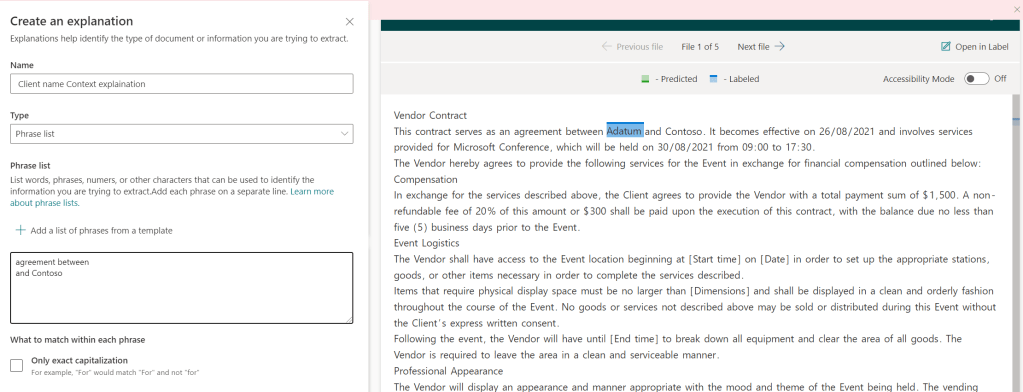 We add several explanations to our model to help it accurately predict classifications, here we’ll go with some simple currency, date and time templates as we know all event management contracts will contain all three in some format.