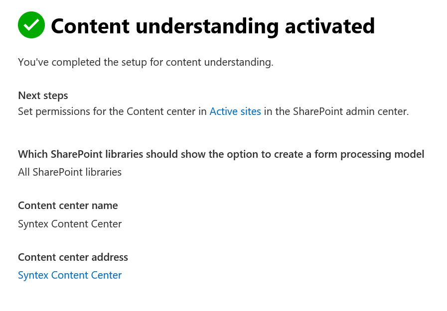 To illustrate the power of SharePoint Syntex, after the licensing has been added, navigate to Setup -> Organizational Knowledge in the Microsoft 365 Admin Center. Select Content Understanding Setup and configure the libraries you would like to enable for Form Processing. For now we’ll select ‘All SharePoint Libraries’. For Document Understanding we will name our Content Center site and finish setup by clicking Activate. Additional Content Centers can then be created from the SharePoint Online Admin Portal.