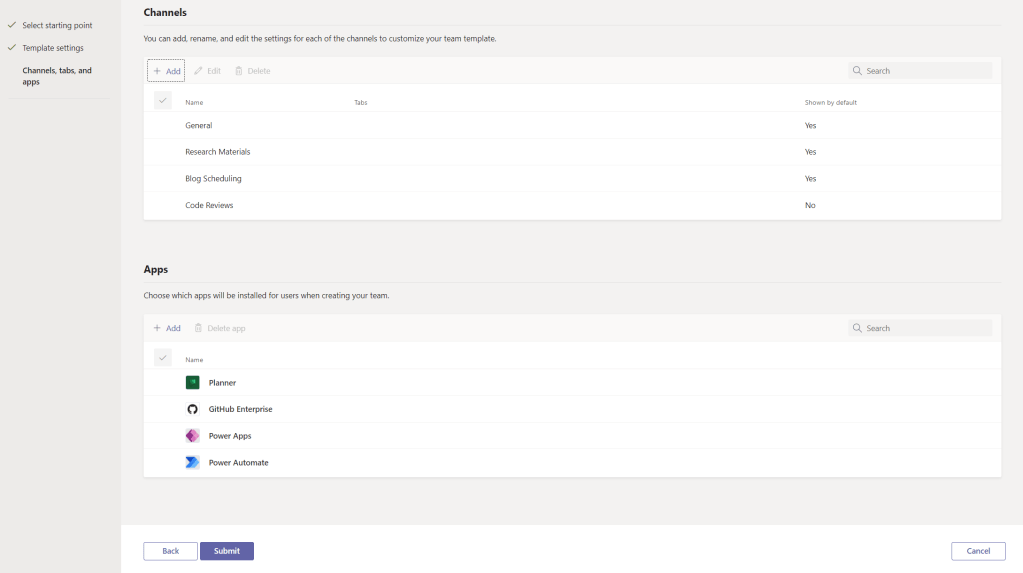 Add in the Channels and Apps that the Teams should contain and when done, click ‘Submit’ to save the template. This template is now ready for deployment.