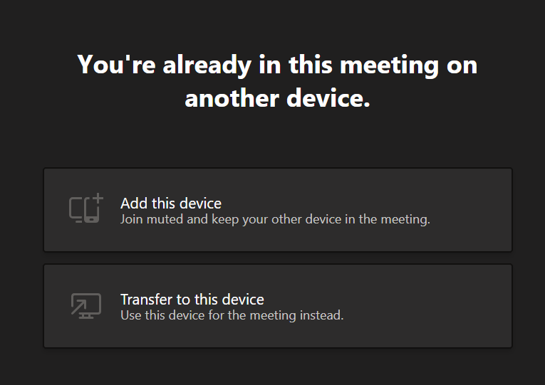 Since the recent Teams update, now when I’m in this situation, I get the below banner informing me I’m in a meeting on another device and giving me the option to join, nice!