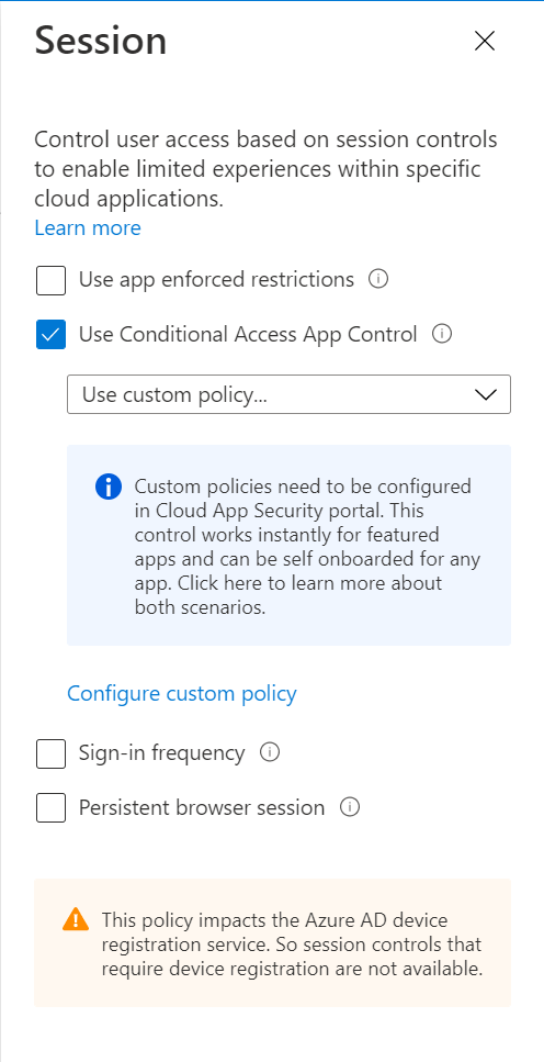 The first step is to ensure our users are redirected to MCAS. To do this we can configure a Conditional Access policy in Azure AD, in this policy we specify the following: