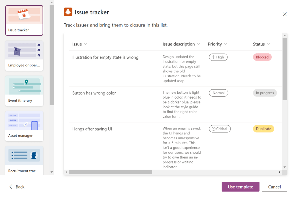If we use one of the predefined templates, we can see our list is prepopulated with the relative columns we would need for an Issue Tracker for example.
