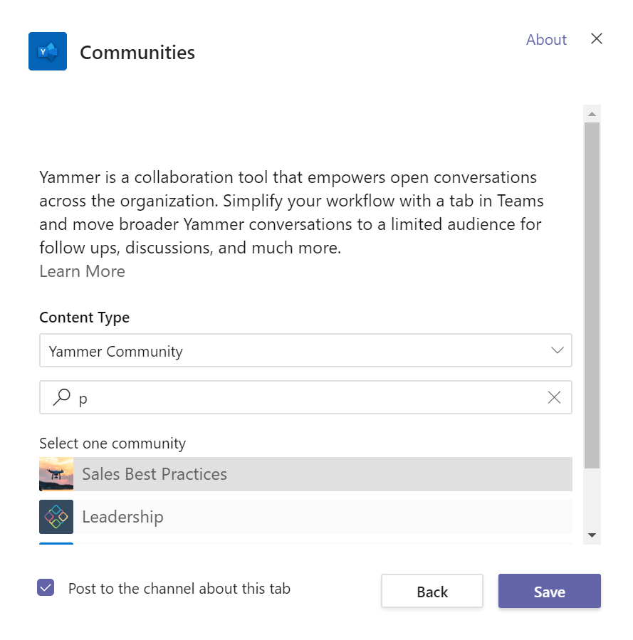 This is a nice way to use Teams to obfuscate the back end tools and bring the functionality right to the user. While this is a nice feature, the real power of the communities app comes when it is added to a Team channel.