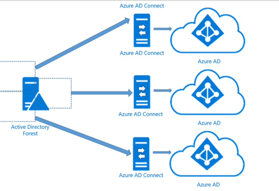 A common scenario with large organizations, particularly with ongoing mergers, acquisitions and divestitures is a group of Active Directory forests, trusted or untrusted, connecting to a single tenancy.