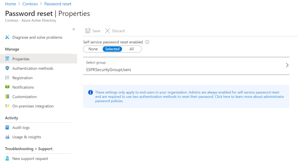 SSPR can be enabled from the Azure AD Portal under the Password Reset option. We can enable for all or selected users based on group membership: