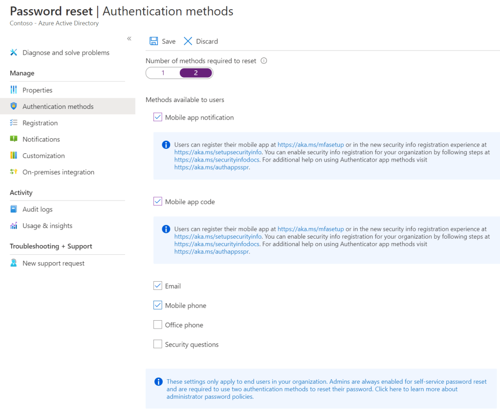 To authenticate our users during a password reset, we can configure the number of methods that our users will need to use to reset their password. We can also specify which methods are available to them.