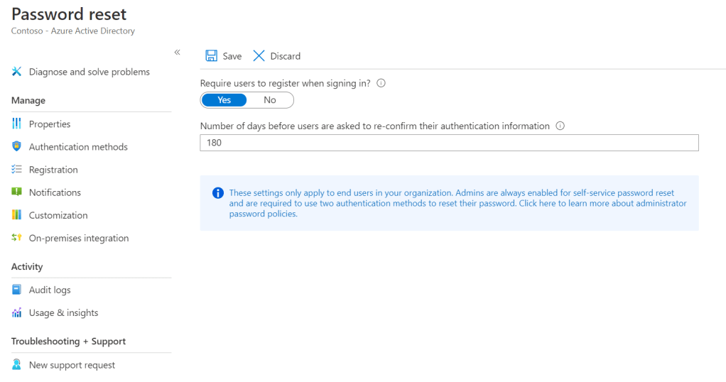 To ensure our users are configured for SSPR, we can configure the registration options, this will prompt our users to fill out the required SSPR details at login. We can also ask them to confirm this information after a certain period to ensure it’s up to date.
