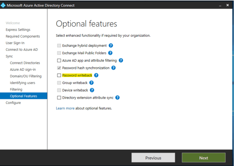 Another option we’ve seen in the AD Connect configuration is Password Writeback. This option allows the synchronization of password changes to flow from Azure AD to our on-premises infrastructure. While there are a few instances where this can be useful, the biggest benefit we see from this functionality is providing users with Self-Service Password Management.
