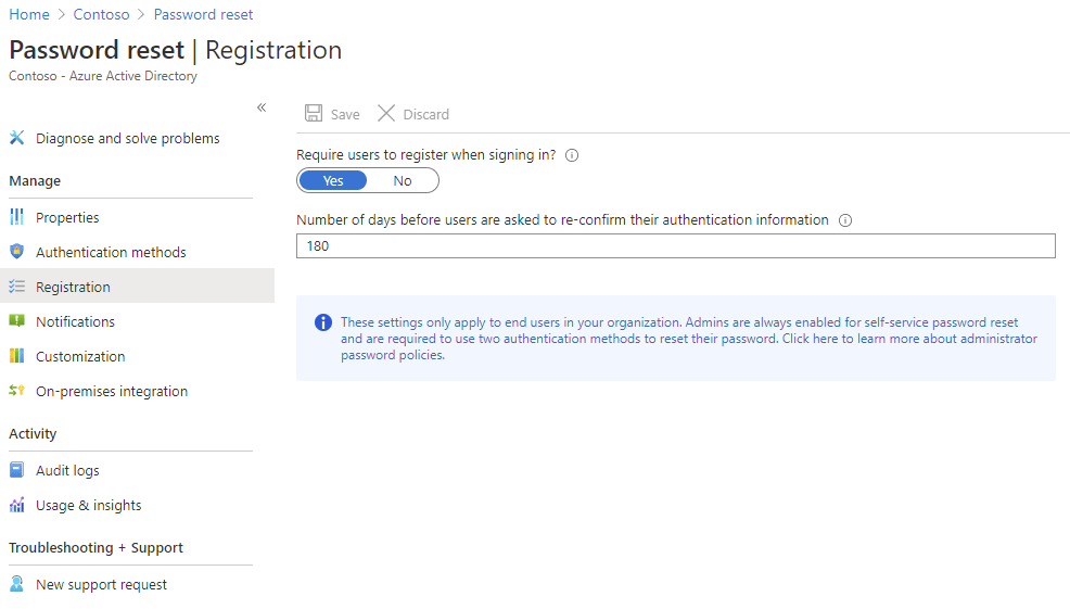 Next we can configure if we would like to prompt our users to register when they next sign-in. With this enabled users will be brought to the SSPR registration page and asked to fill in the details we required in the previous step. We can also set a time period to ask them to confirm their details, 180 days by default.