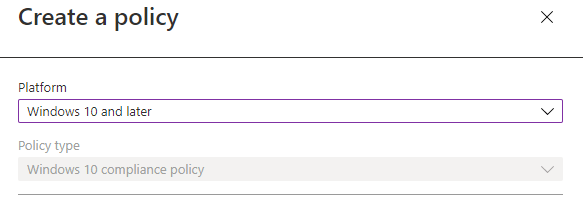 Device compliance policies require a minimum of an Azure AD registered device. We can create and target compliance policies from the Microsoft Endpoint Manager Admin Portal under the “Devices” -> “Compliance Policies” page. Here we will create a basic compliance policy for Windows 10 devices. Select “Create Policy” and choose “Windows 10 and later” as the platform.