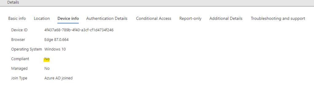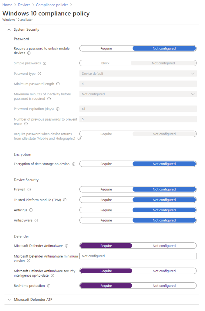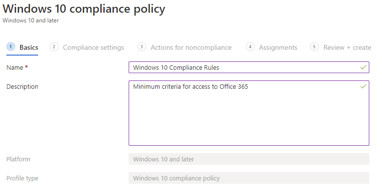 To inform Conditional Access of Device Compliance, we need to first define our compliance policies in Microsoft Endpoint Manager (Intune in this case however with co-management configured, compliance data from SCCM can be used – that’s another topic).