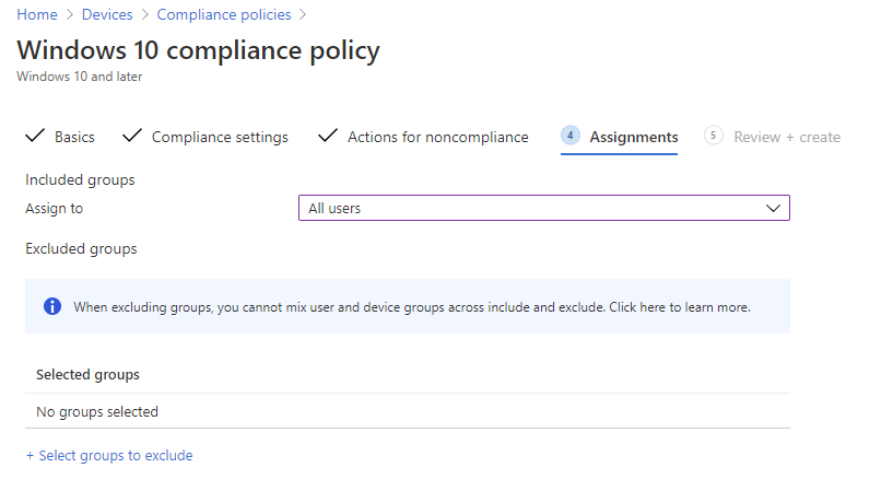 - Require Device to be marked as compliant – Require MEM to report the device as compliant with any assigned policies