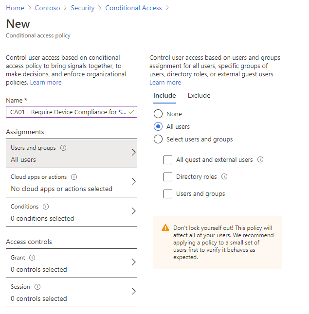We’ve already defined our basic Compliance policy so let’s create a new Conditional Access Policy. We can give it a name of “CA01 – Require Device Compliance for SPO”. In “Users and Groups” we’ll select “All Users”.