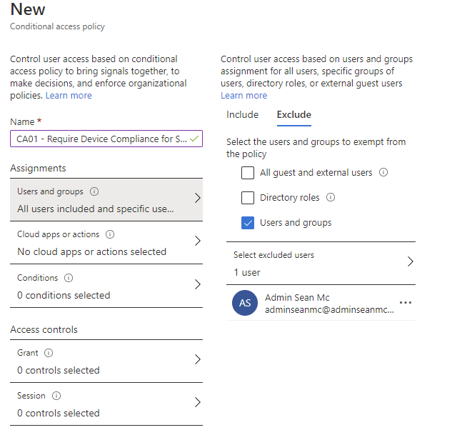 - Users and Groups – We specify which users/groups we want to target with our policy. We have the option to both include and exclude selected users/groups.