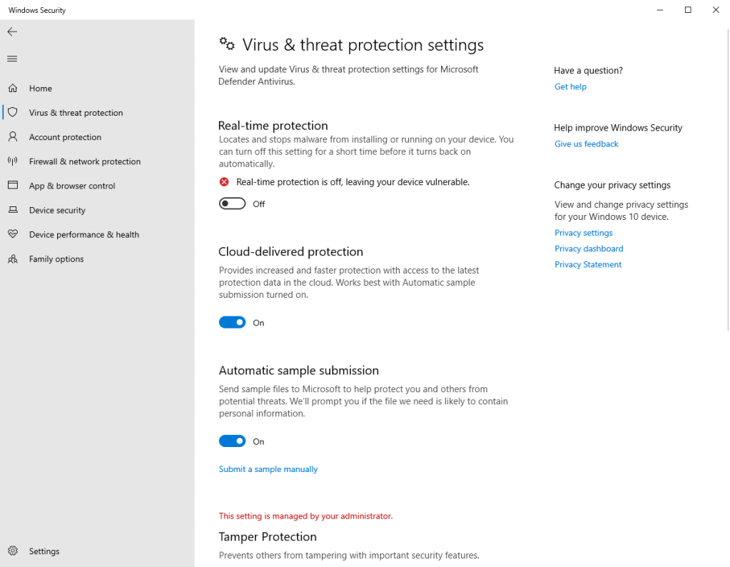 For the purpose of our testing, I’m going to disable the Windows Defender real-time protection on our device. This will move the device to non-compliant so we can test our policies.