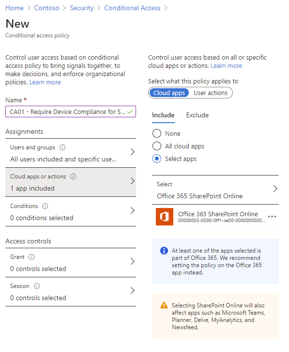 - Cloud apps – Select apps in our directory that will trigger the policy, e.g. Exchange Online or SharePoint Online
