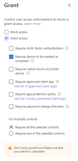 Finally, we can set our Grant control to Grant Access and “Require device to be marked as compliant”