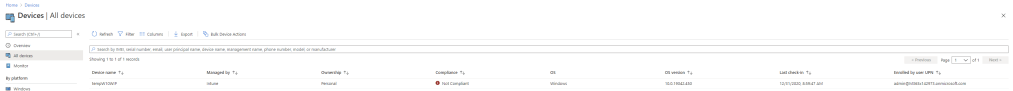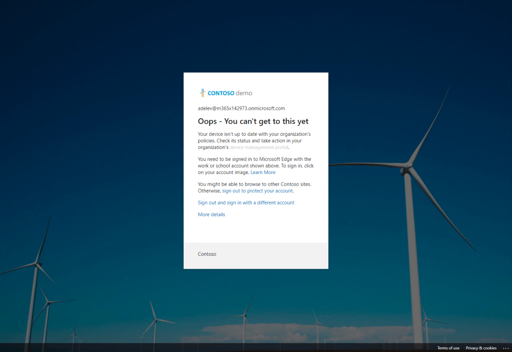 We are blocked! This is because our device in no longer compliant since we disabled Real-time protection in Microsoft Defender. A quick check of the MEM portal shows us the device as non-compliant:
