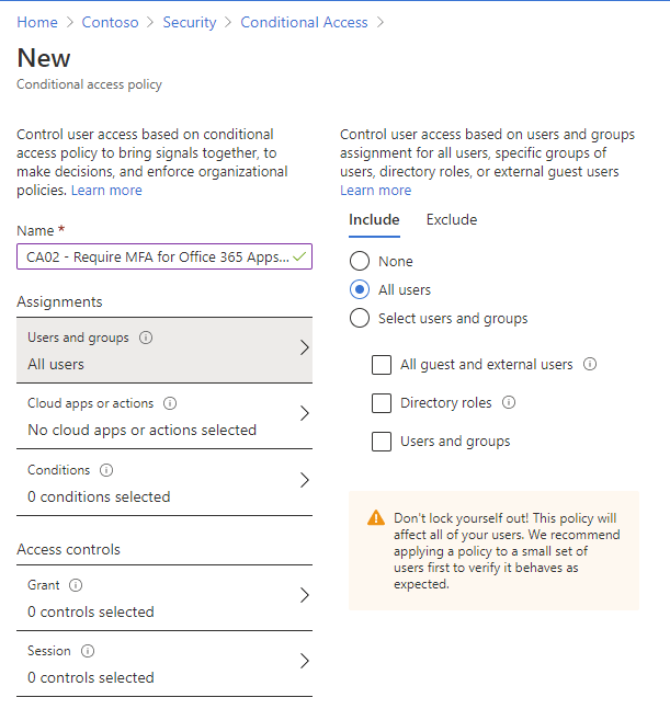 First, let’s give our policy a name “CA02 – Require MFA for Office 365 Apps for All Users Except from Trusted Locations” and assign to all users. At this point we should also exclude a “Break Glass” admin account, in the event of an MFA outage we’ll need top access the tenant to get it up and running.