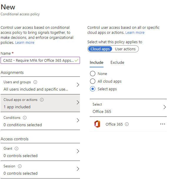 - Cloud apps or actions – We include or exclude specific cloud apps or actions to target