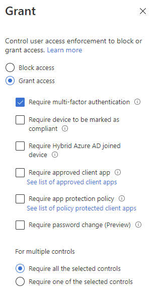 - From the above Grant controls, we can select to require all of our selected controls or just meet one