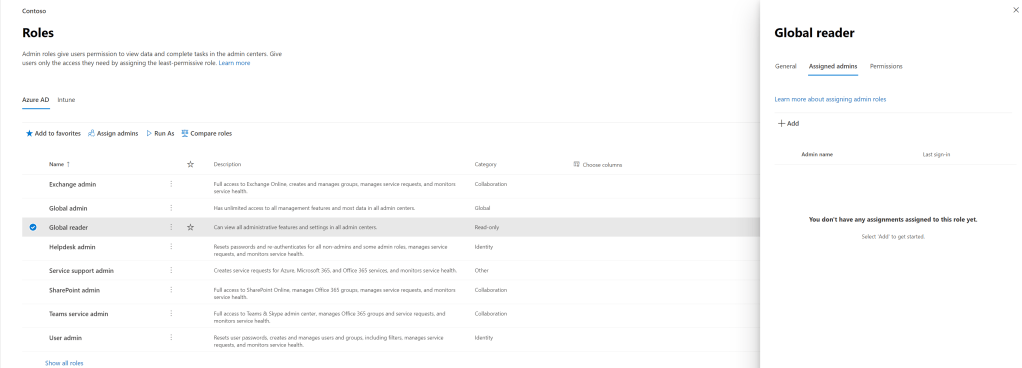 To assign a role to an account, simply select the role we want to assign, in the pop-out pane, select “Assigned Admins” and click “Add”.