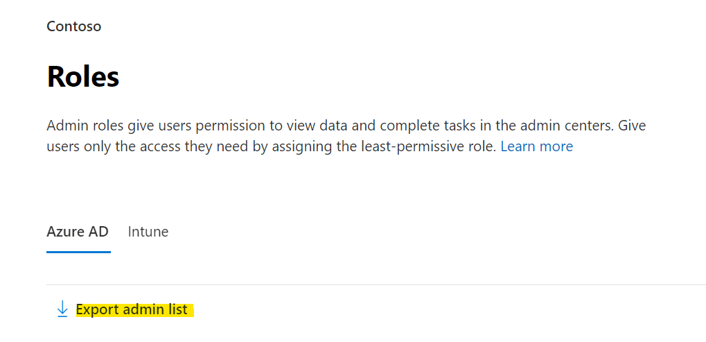 The quickest and easiest way to get a list of admin role assignments is directly from the “Roles” page. We have an option near the top to “Export Admin List”. This option will export a comma-delimited CSV listing all of our users with Admin roles assigned.