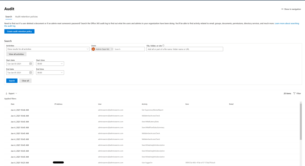 Note that we can filter by specific activities and we can also return non-admin activities. We can also user the “Export” button to export our search results to CSV. We will go through Audit Log Search in detail in a future post. It is also possible to search the Unified Audit Log through PowerShell with the Search-UnifiedAuditLog cmdlet.