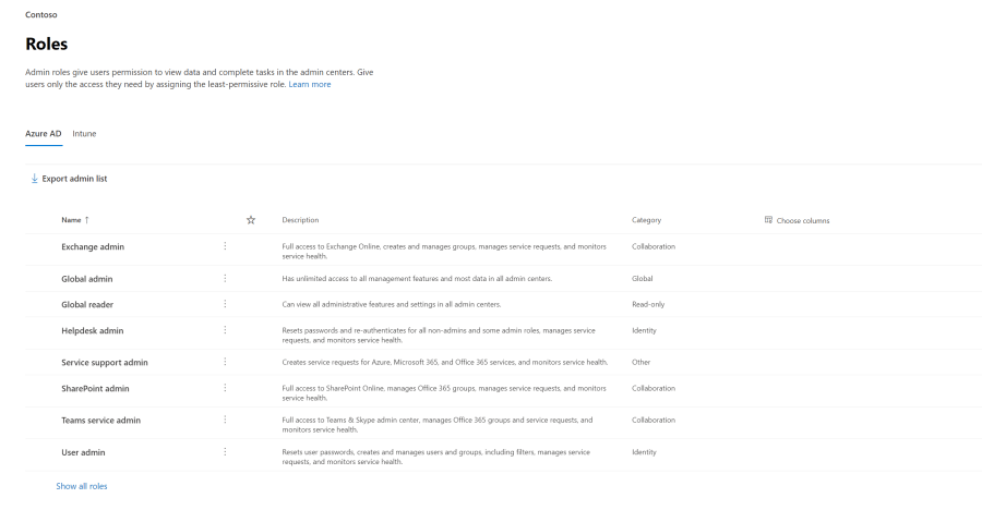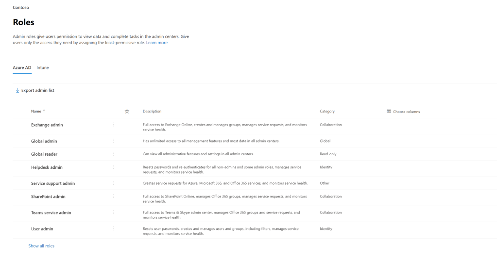 To add a user to a role, open up the Microsoft 365 admin portal and open up the Roles section. From here we can see the roles we have available for assignment along with a description and category to help us ensure we assign the appropriate role.