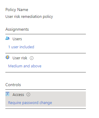 We configure a User Risk Policy from the Identity Protection section of the Azure AD portal. Here, we select the users to include in our policy (this should be limited to licensed users at a minimum), the risk level and the control. In the below example, we have specified that is user risk is medium or above, we will let them sign-in but enforce a password change. This will not bypass regular controls such as Conditional Access, MFA etc. but when a user account credentials are expected to be compromised, we are triggering the user to change their password.