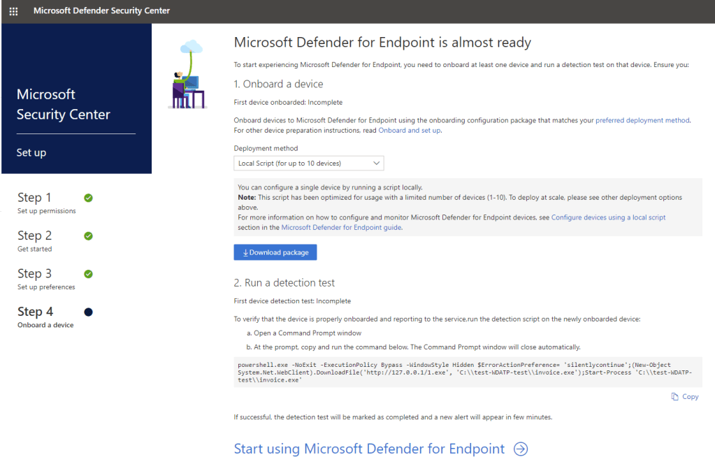 Once the initial configuration has finished, we will see the device onboarding options screen. We can use this to onboard our first device. We can skip this for now by clicking “Start using Microsoft Defender for Endpoint” and onboard later.