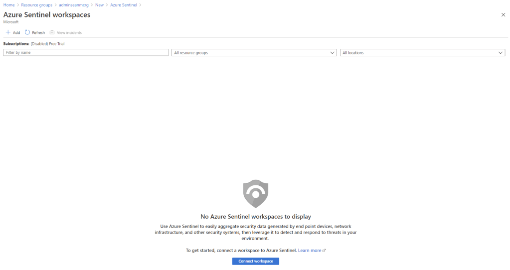 Next, we need to add a log analytics workspace, click “Connect workspace”.