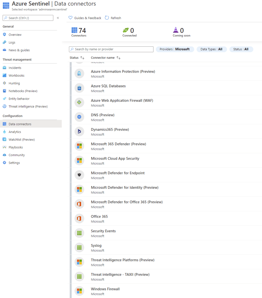 When the workspace is linked and Azure Sentinel is added we need to add our data connectors, on the main Azure Sentinel page, select “Data Connectors”. On this page we will see the list of supported connectors provided by Microsoft, the list is huge and most of it will be out of scope for this exam. If we filter by Microsoft, we can see a lot of the connectors we may be interested in.