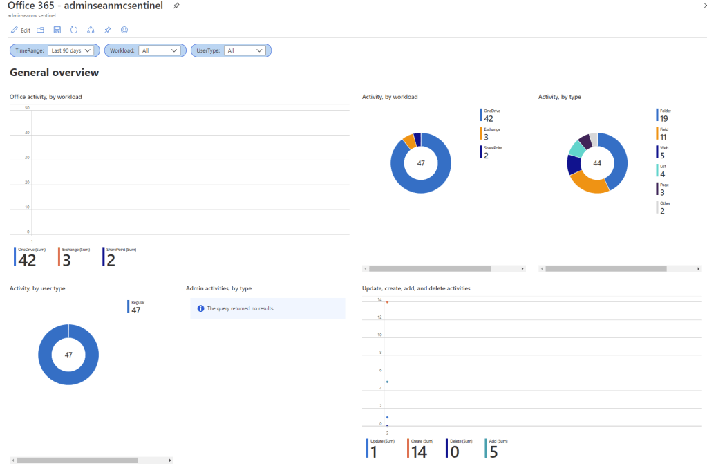 In the Office 365 workbook we can see a breakdown of activities in our Office 365 environment, we can filter by date, workload and user type if we like and event see all of the recent activity in our environment. If we like, we can modify the workbook with the “Edit” function to shift things around and add/remove items and queries to customise and prioritise the relevant data. (note: As this is a lab environment, there’s not a whole lot of data in my screenshots)