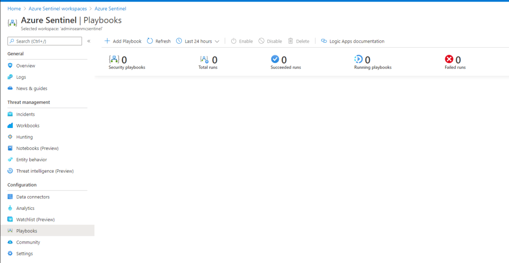 In the previous post we configured Azure Sentinel and integrated our Office 365 service, with the configuration in place, we can now look at how we can leverage Sentinel. The first thing we will look at is configuring Playbooks. Azure Sentinel Playbooks are essentially a set of steps, based on Logic Apps, which can be defined to automate the response/remediation of alerts. To get started, open up the “playbooks” blade in the Azure Sentinel instance. Here we will see any playbooks we have in place and we can create a new playbook by clicking the “Add Playbook” option at the top of the page.