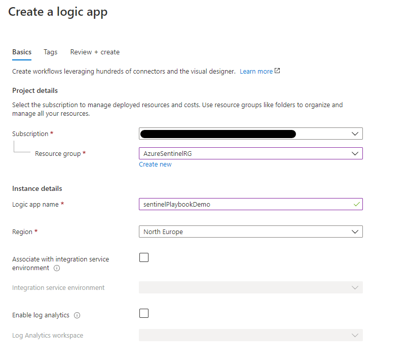 Adding a playbook will bring us to the “Create a Logic App” page, here we need to detail the usual Azure resource requirements like subscription, resource group, region and name. Fill in the relevent details and click “Review + Create” to continue, then “create” on the summary page.