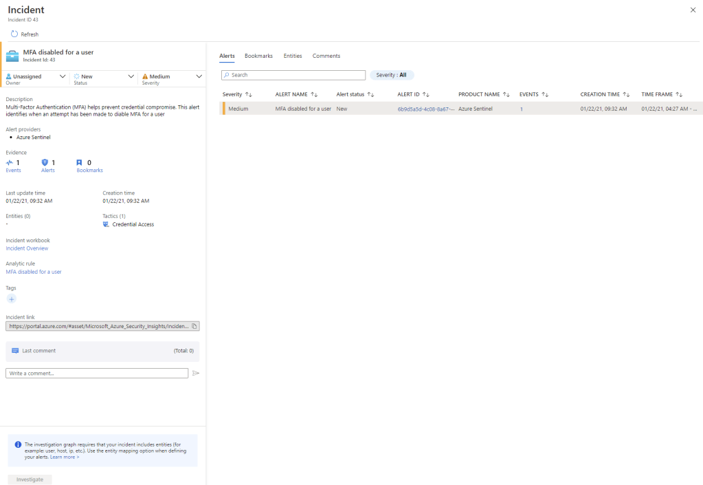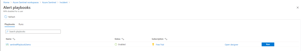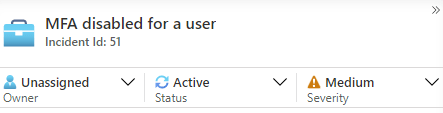There are two ways we can initiate playbooks, we can either manually initiate as a response to an alert, or configure a specific type of alert to automatically trigger the playbook. To test, I have generated an alert by adding the rule “MFA disabled for a user” from the Azure AD connector. In the incidents blade, we can see two alerts from that rule.