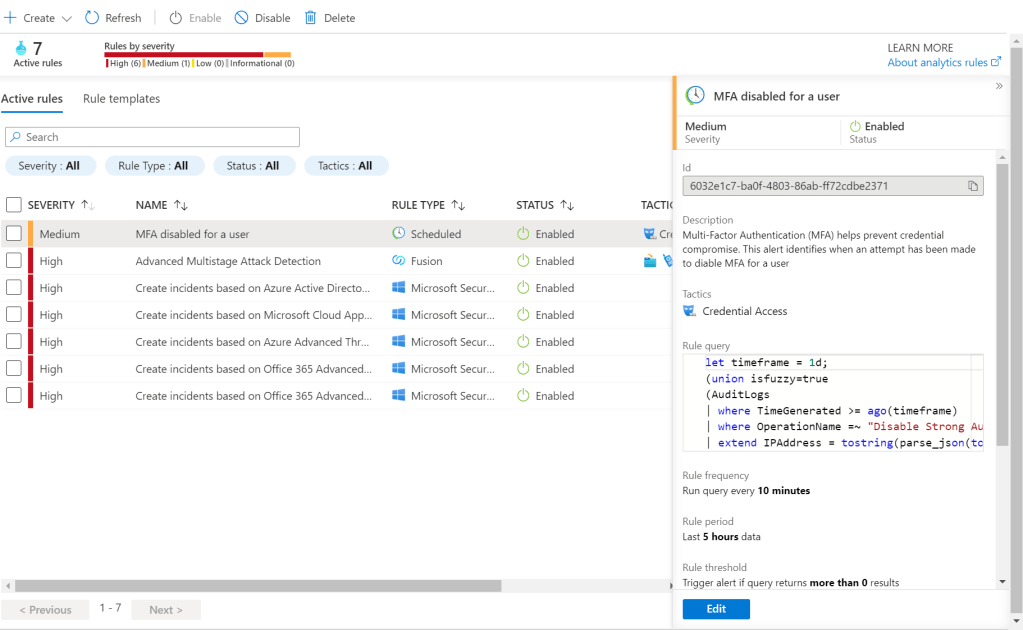 I created a rule based on the Azure AD rule template “MFA disabled for a user” earlier so I’ll use that. Once your rule is in place, click on it and hit “Edit” in the right pane.