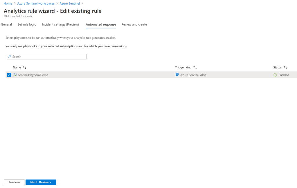 In the rule editor, we can modify the settings of the rule including the query that is used to detect and trigger alerts. Navigate to the “Automated Response” page and select the playbook you want the alerts to trigger.